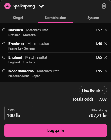 Med Flex Kombi kan du skapa dina egna kombinationsspel och själv bestämma hur många val som måste sitta. Du väljer redan från start om ett eller flera spel får förlora, och ändå ha chans på vinst. Ju fler fel du tillåter, desto lägre blir oddset. Väljer du istället att alla val på kupongen måste gå in, får du ett högre odds – men med högre risk.